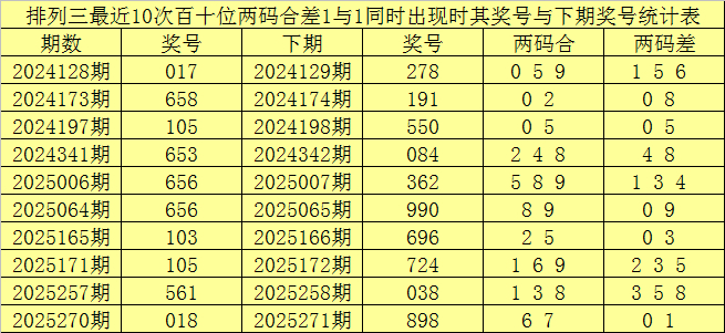 百十位合差分析:上期奖号百十位开出01组合,两码合为1,两码差为1,最近10次百十位两码合1与两码差1同时出现时,其奖号和下期奖号分别为: