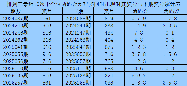 十个位合差分析:上期奖号十个位开出16组合,两码合为7,两码差为5,最近10次十个位两码合7与两码差5同时出现时,其奖号和下期奖号分别为: