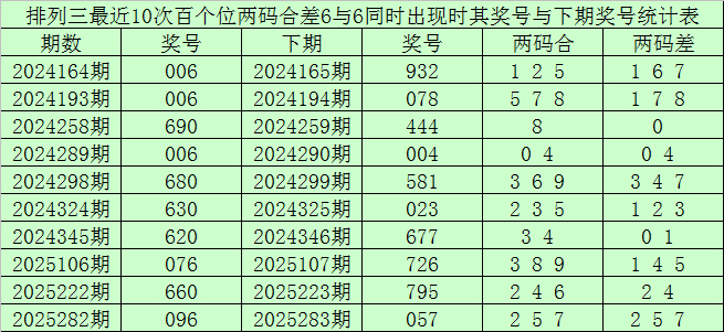 百个位合差分析:上期奖号百个位开出06组合,两码合为6,两码差为6,最近10次百个位两码合6与两码差6同时出现时,其奖号和下期奖号分别为: