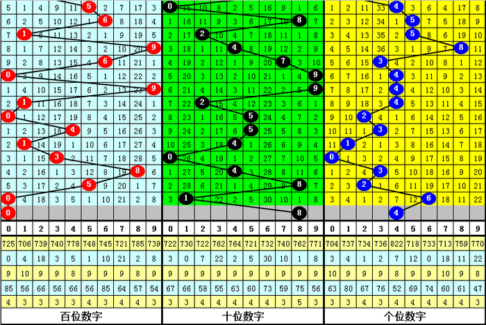 从以上统计可以看出,百个位两码合差6与6同时出现之后其下期两码合差表现最热的4个分别为:1234,本期百个位两码合差可以参考这四码中的数据。
